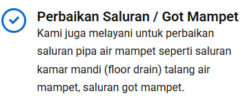 Ya, kami memberikan garansi pekerjaan untuk layanan tertentu, terutama untuk pelancaran saluran mampet. Jika masalah yang sama terjadi lagi dalam periode garansi (misalnya 30 hari) di titik yang sama, kami akan datang kembali untuk menanganinya. Kepuasan Anda adalah jaminan kami.
